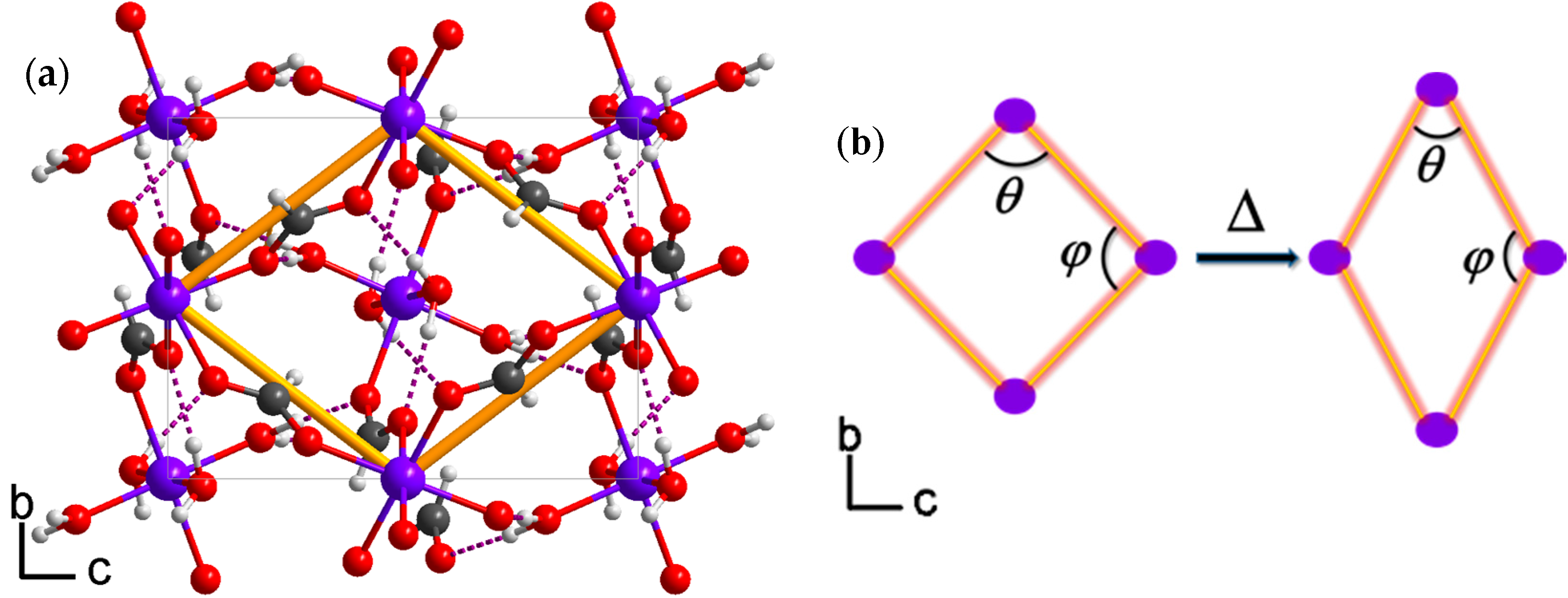 Thermal expansion mechanism of framework 1. (a) The yellow framework frames represent ‘hinge-strut’ like structure and violet dotted lines represent hydrogen bonds. Color scheme: Zn, purple; O, red; C, dark grey; H, 25% grey; and (b) The decreasing of hinge angle θ, from 105.5° at 120 K to 105.1° at 240 K, and coupled with the ϕ increased from 74.5° at 120 K to 74.9° at 240 K upon heating.