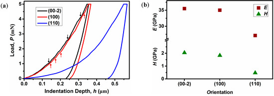 Nanoindentation experiments were conducted using a Berkovich tip with a radius of ~50 nm in quasi-static mode [29,30,31], and representative load-indentation depth (P-h) curves obtained on the three different natural facets, (00-2), (100), and (110), are shown in Figure 4a. The load segments of the P-h curves on the (00-2) and (100) facets show some small discontinuities (‘pop-ins’), indicating that the plastic deformation which occurs underneath the indenter tip, is heterogeneous in nature. In contrast, the indentation induced plasticity is relatively homogeneous on the (110) face [32].