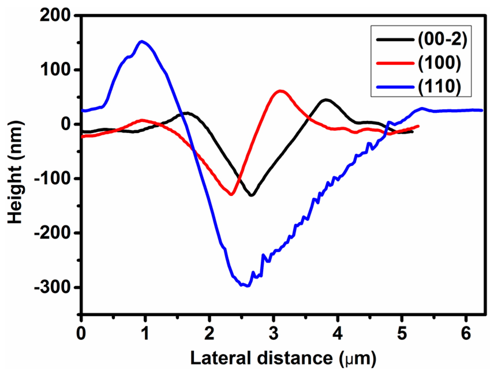 The corresponding cross-sections at the center of the residual indent impressions on (00-2), (100), and (110) facets.