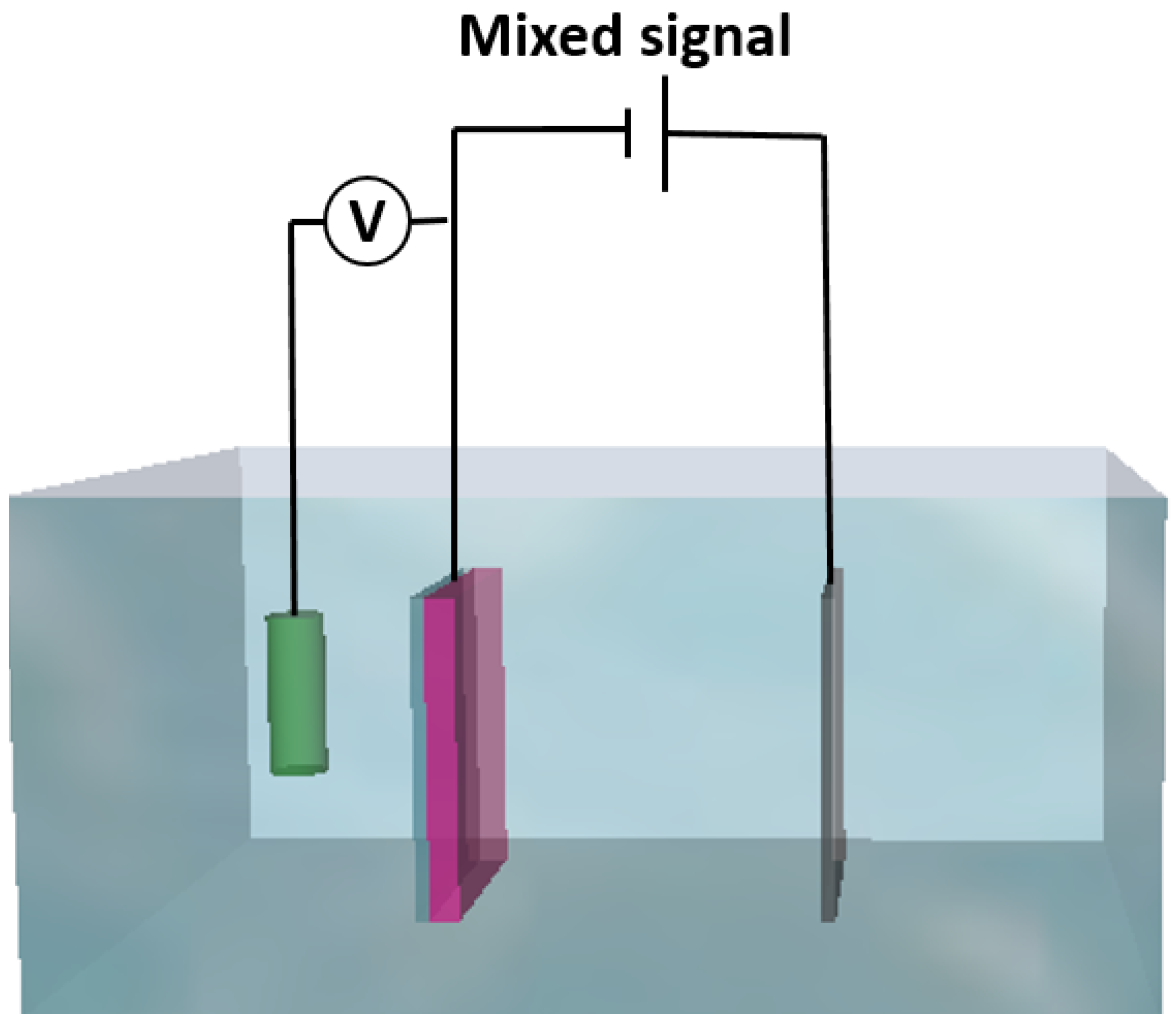 The sample preparation process begins from a 300-µm-thick silicon substrate. Cr-Au films with thicknesses of 10 nm and 150 nm, respectively, are deposited on a silicon substrate by sputtering. A three-electrode electrochemical deposition method is used as follows: the 300-µm-thick silicon substrate with a Cr/Au seed layer is used as the working electrode, a platinum mesh is used as a counter electrode, and Ag/AgCl with a 3 M KCl (Potassium Chloride) solution is used as a reference electrode. A schematic of deposition system is shown in Figure 1.