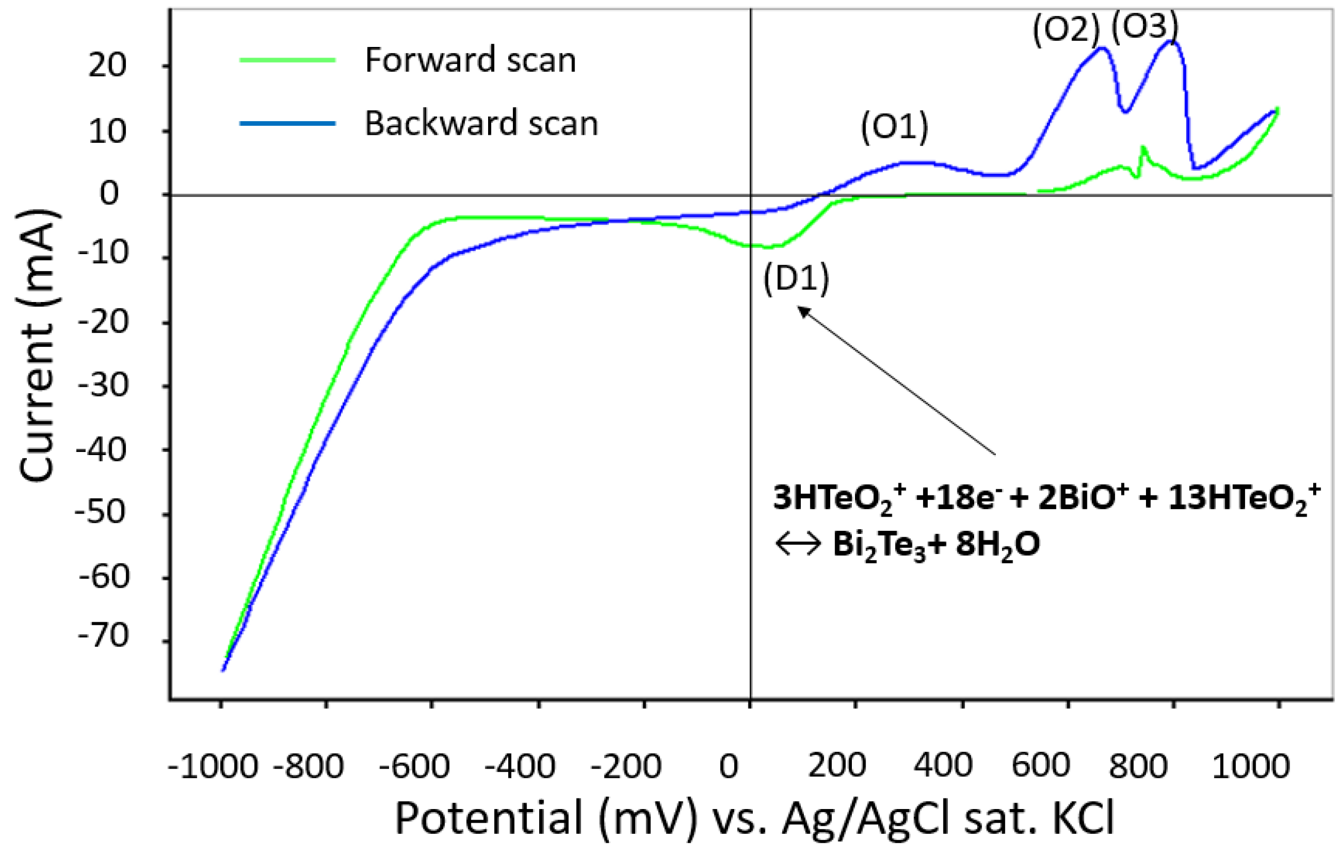 The cyclic voltammetry (CV) presented in Figure 2 is recorded between −1 V and 1 V with a scan speed of 10 mV/s. The literature states that, during the deposition process, the first main reduction relates to the formation of BiTe films [19,20]. In this work, the first reduction ranges between −0.1 V and 0.1 V. During the backward scan, three oxidation peaks, O1, O2, and O3, appear at 300 mV, 600 mV and 800 mV, respectively. Peak O3 belongs to the depriving process of Bi and Te on the gold surface. Peaks O1 and O2 represent an oxidation of the residual elemental Bi [19,20]. From the CV curve, the appropriate potentials for growing BiTe films are determined to be among the first reduction peak occurring at approximately 20 mV.