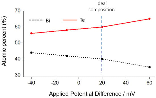 First, constant deposition is used to synthesize thick Bi2Te3 films. From the CV analysis, some deposition potentials in the first reduction range are examined to evaluate the potential dependence on the atomic composition, as shown in Figure 3. During the deposition process, BiTe stoichiometric formation is obtained from the balance of potential-dependent chemical kinetics for the deposition of both bismuth and tellurium [19]. That balanced stoichiometry is obtained at the potential where the first reduction peak of the electrolyte CV curve is observed, as shown in Figure 2. Because the reduction potential of tellurium is greater than that of bismuth, the atomic composition of tellurium is more advantageous than that of bismuth when the applied potential is larger than the balanced stoichiometry. In contrast, if the potential is smaller than that of balanced stoichiometry, more bismuth atoms will be deposited, as shown in Figure 3. From the results, 20 mV is determined to be the most balanced stoichiometry potential to electrochemically deposit Bi2Te3. At −40 mV, bismuth telluride is synthesized in the form of Bi2.3Te2.7, and Bi1.8Te3.2 appears at 60 mV.