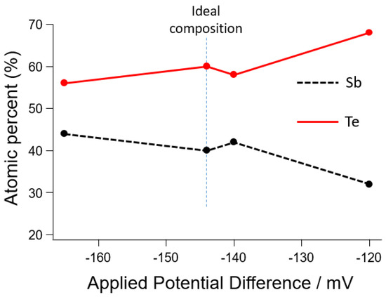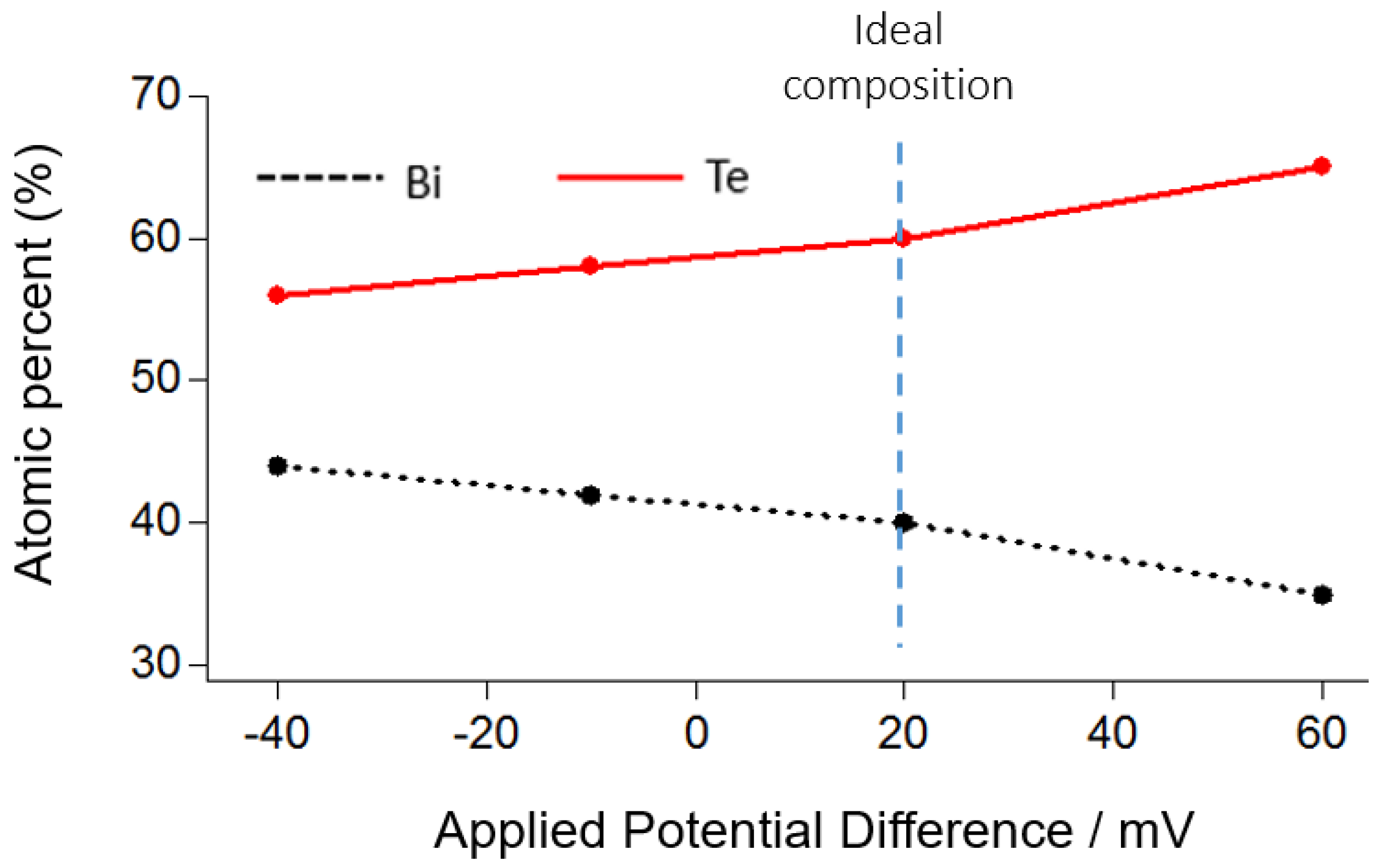 The dependence between deposition potentials and atomic composition in the range of suitable potentials from the CV measurement is also investigated, as shown in Figure 17. The ideal composition of 40 atomic % Sb and 60 atomic % Te is achieved at a potential of -144 mV. In the SbTe formation, antimony is deposited at a higher potential than bismuth and in the region where the tellurium deposition potential is already large. Therefore, a stronger stoichiometry dependence on the deposition potentials than for BiTe is predicted.