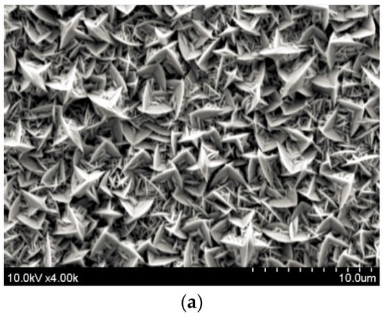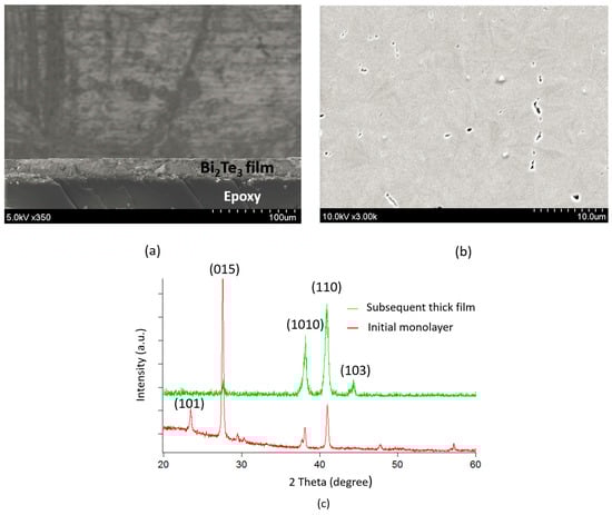 The working mechanism is as follows. During the deposition cycle with Eon = 20 mV, the reduction reaction can be precisely controlled to grow material and during the cycle with Ioff = 0, any undesired reactions are prevented. The pulse width is set to 0.1 s for the ON status and 0.2 s for the OFF status. The advantages of the pulsed deposition over constant deposition is that it can balance the loss of ions at the surface of the working electrode that occurs when a constant potential is applied to ionize the electrolyte [22]. In principle, the pulsed deposition is used to ensure the amorphous material deposited during the ON period is in a position to crystallize during the OFF period. Significant improvements may be due to two different effects of the crystal growth: new crystals can grow on the surface as a homogeneous distribution, or atoms and ions can be added to any existing layers. A small surface diffusion and a high electrochemical potential possibly incite the growth of new crystals, whereas a high surface diffusion and a small electrochemical potential can promote the adhesion of formed atoms to existing layers. During pulsed electrochemical deposition, a better supply of material within the solution may result in crystal growth [23]. This is proven in Figure 4b and Figure 10. The surface of the Bi2Te3 deposited by the pulsed waveform is more uniform and smoother than that for a constant deposition. Although the surface of the sample prepared by pulsed deposition method is dense, it is rough and loose with dendritic growth for the constant deposition method. The 10-µm-thick sample synthesized by constant deposition shows a roughness of 2 µm. This is much larger than the 300-nm roughness of the sample formed by the pulsed deposition method. The crystal size of approximately 1 µm formed by constant deposition is apparently smaller than that of the pulse deposited crystals (~5 µm). This is related to the diffusion limitations during the constant deposition, since the lateral growth is restricted if enough ions are not supplied to the edges of the crystals. As a result, the new crystals will tend to grow on the top of the already formed crystals to create a standing shape, as shown in Figure 4b. Therefore, the size of the crystals becomes narrower. For the films deposited using the pulsed method, much wider crystal sizes are obtained, as shown in Figure 10. Again, the observation of the material cross-sections shown in Figure 11 confirms this explanation. The crystals deposited by pulsed deposition are formed uniformly to create a more reinforced compact structure than that from constant deposition. However, the effect of the pulsed deposition method will be limited if the deposition rate is too high during the ON period. A long OFF period is not really effective in this case. Therefore, a millisecond pulsed deposition is first presented in Reference [23] to solve this issue. The purpose of this method is to limit the high deposition rate during the ON period. In this work, we propose another approach of low concentration electrolytes. Additionally, the usage of soluble anodes can stabilize the deposition, but it may affect a low concentration of ions and cations. Therefore, electrolytes are renewed frequently to avoid a significant depletion of low concentrations of the species.