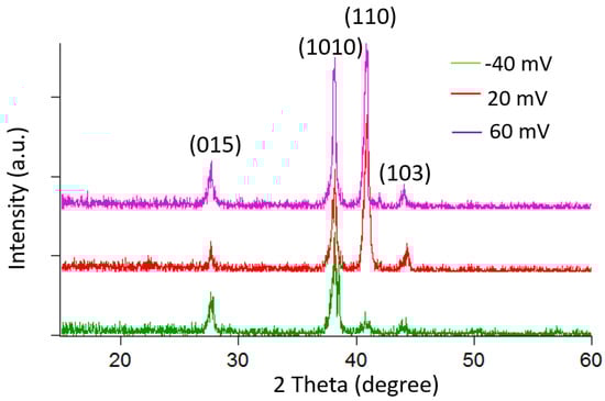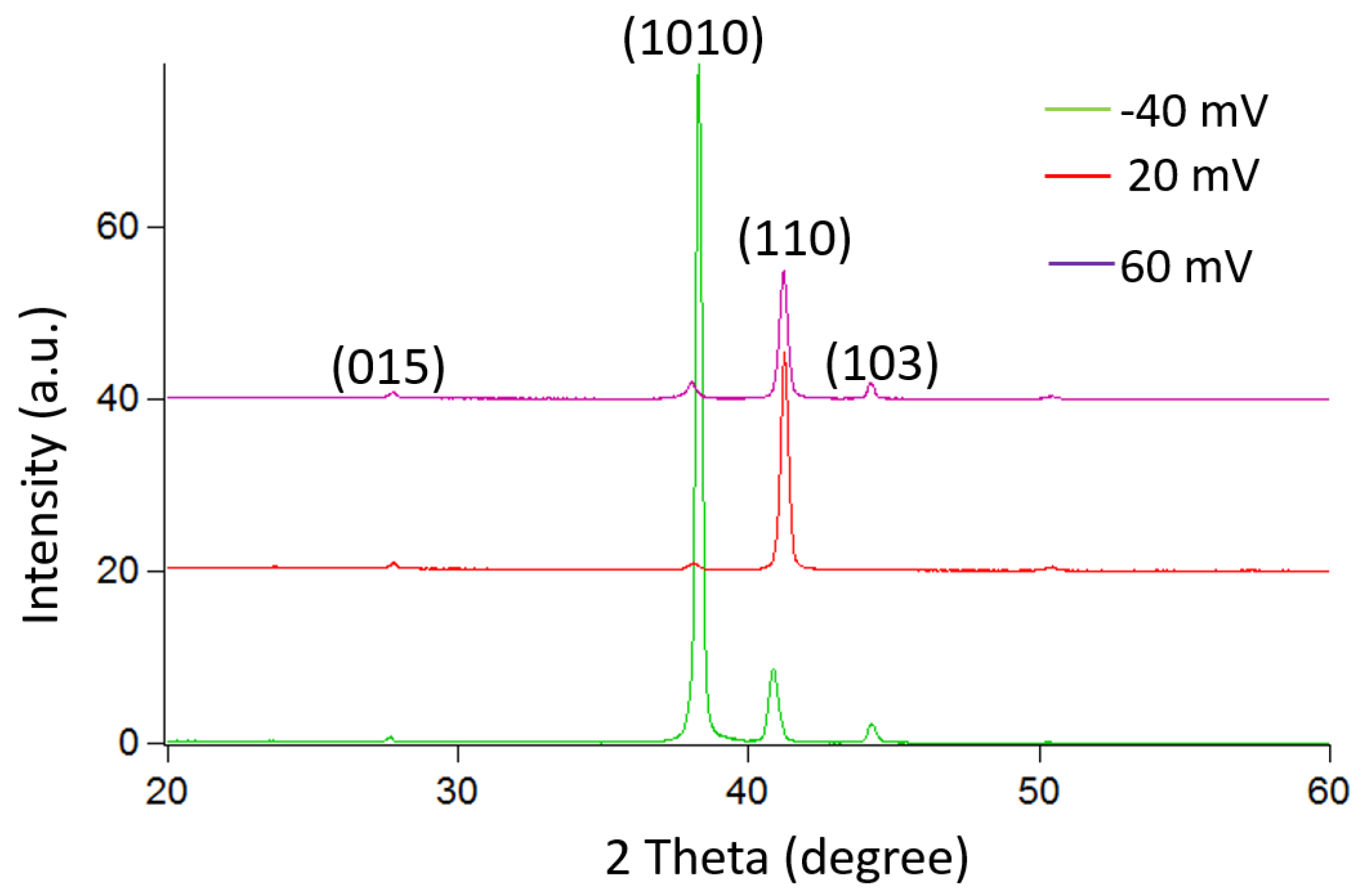 The deposition potential not only changes the atomic composition of the material but also has a significant effect on the crystal morphology. Figure 4 shows the deposition potential dependence of the surface morphology of the film. The sample synthesized with a potential of −40 mV exhibits a standing plate-like shape with large grains of approximately 4 µm. When the deposition potential increases to 20 mV, the grain size decreases (~1 µm) and changes to a granular structure for a deposition potential of 60 mV. An XRD measurement is also performed to analyze the effect of the deposition potential on the crystal growth orientation.