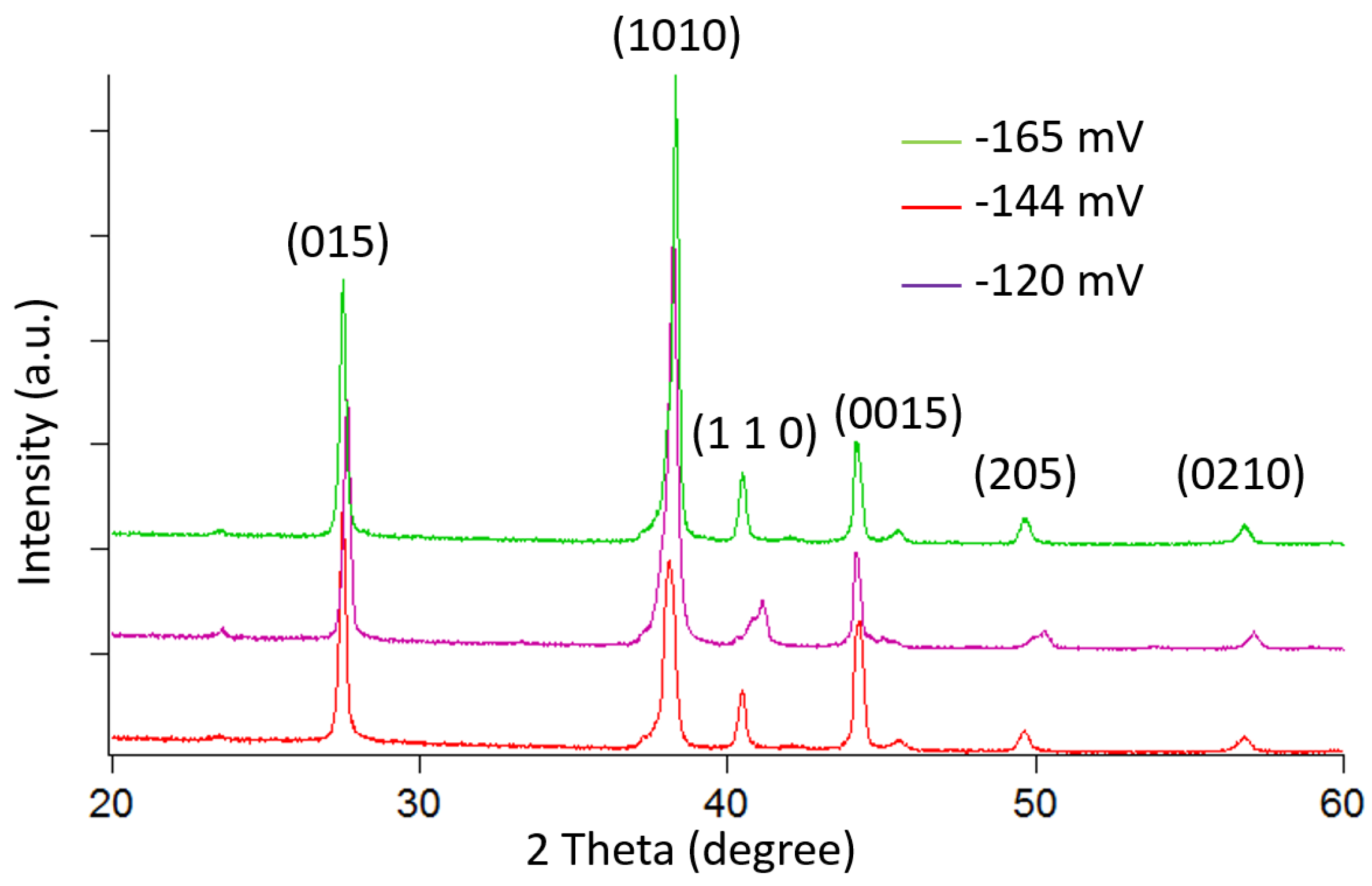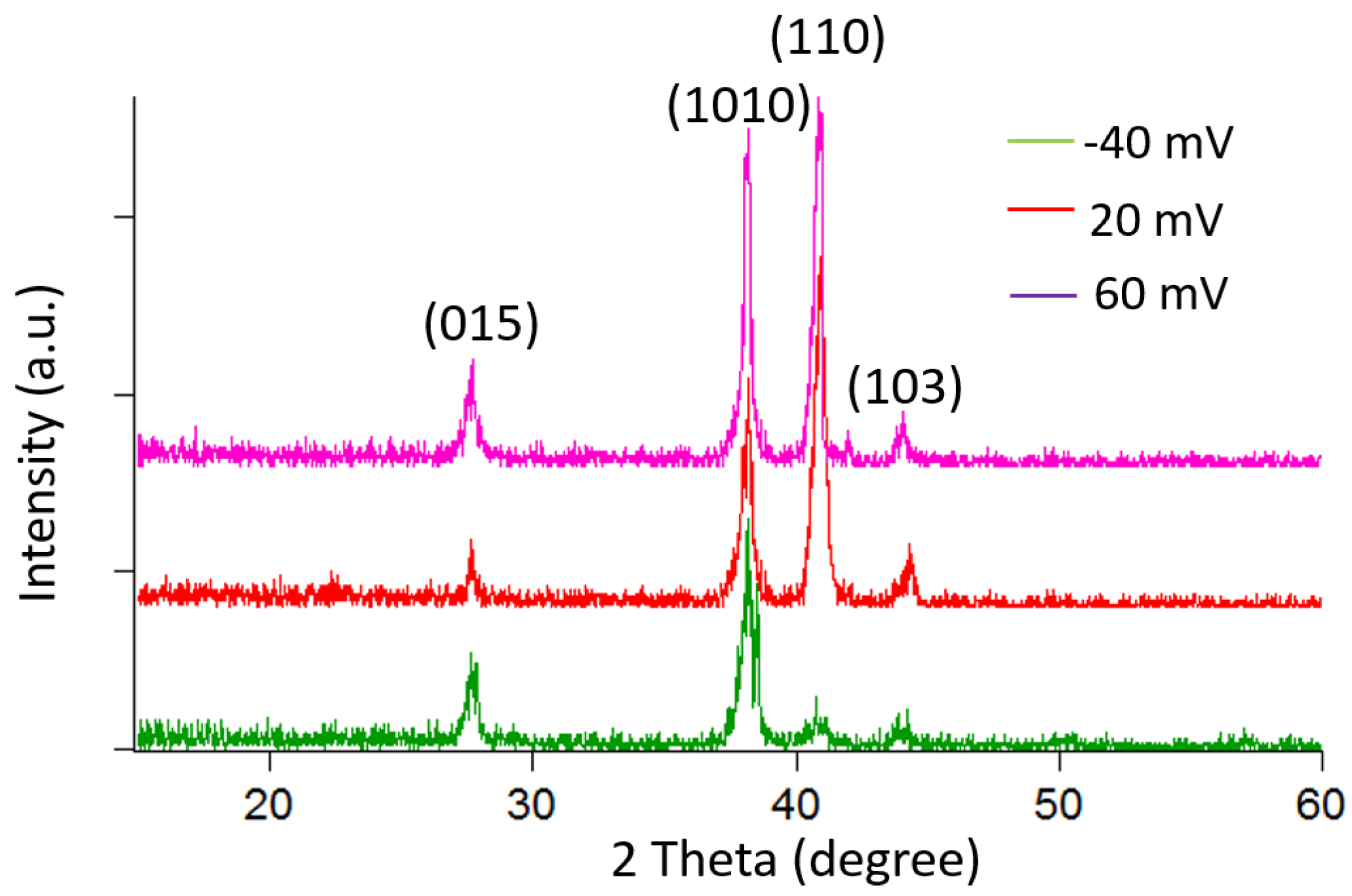 Figure 5 shows the XRD patterns of the deposited bismuth telluride films, which exhibit a polycrystalline structure with (110), (1010) and (015) as the prominent diffracted peaks. However, the intensity ratios of the peaks are not similar for each deposition potential, indicating an effect on the growth orientation.