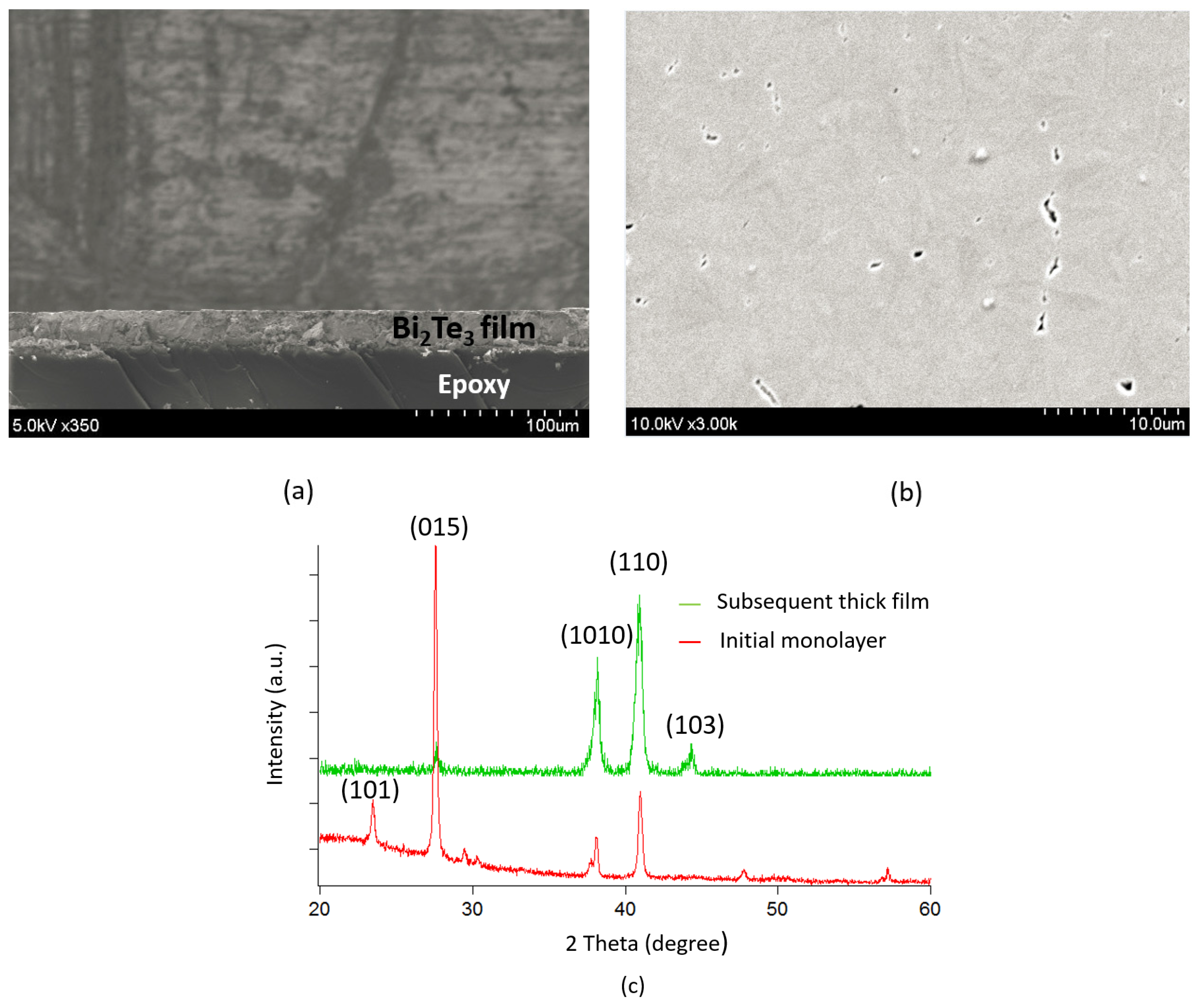 Among thermoelectric materials, N-type bismuth telluride (Bi2Te3) and P-Type antimony telluride (Sb2Te3) are attractive due to their high performances for thermoelectric power generation applications near room temperature. Thick films of thermoelectric material with a high Seebeck coefficient and low electrical resistivity are highly desired to fabricate high performance micro power generator devices. There are many methods aimed at synthesizing these materials [1,2,3,4]. Electrochemical deposition is one of potential methods for thick film deposition [3]. In this method, it is reported that optimized techniques can enable the synthesis of materials with high quality morphology and compactness. One of them is a pulsed deposition method. The advantage of pulsed deposition is first demonstrated in Reference [5]. According to this reference, thick and compact Bi2Te3 films are deposited at a rate of 50 µm/h using electrolytes with high concentrations of 80 mM Bi3+ and 90 mM Te2−. However, the Seebeck coefficients of synthesized films are very low (~−40 µV/K). Another option is an addition of non-aqueous electrolytes that leads to high ion solubilities. Many non-aqueous additives have been researched for Bi2Te3: ethylene glycol [6,7] dimethyl sulfoxide [8,9], ethanol [10], ionic liquids (choline chloride) [11,12], molten salt (AlCl3–NaCl–KCl) [13], and polyvinyl alcohol [14]. Additionally, the appearance of the Bi2Te3 soluble anode is proven to enhance a homogeneous composition of deposited films in References [14,15,16]. In this work, another possibility of a deposition of thick and stable thermoelectric films has been demonstrated. The electrolytes are used with a low concentration of cations and ions, resulting in a controlled low deposition rate. The concentrations of Bi3+ and Te2− are 4 mM and 3.6 mM, respectively. Therefore, the amorphous material is easily crystallized during the pulsed deposition. By this method, without the necessity of using non-aqueous additives and a soluble anode, the Seebeck coefficients of synthesized Bi2Te3 thick films are more improved than that of using high concentration electrolytes [5], and the same as using a soluble anode (~−80 µV/K) [15,16]. Additionally, this mechanism is successfully applied for not only N-type Bi2Te3 but also P-type Sb2Te3 thick films.