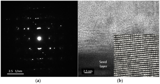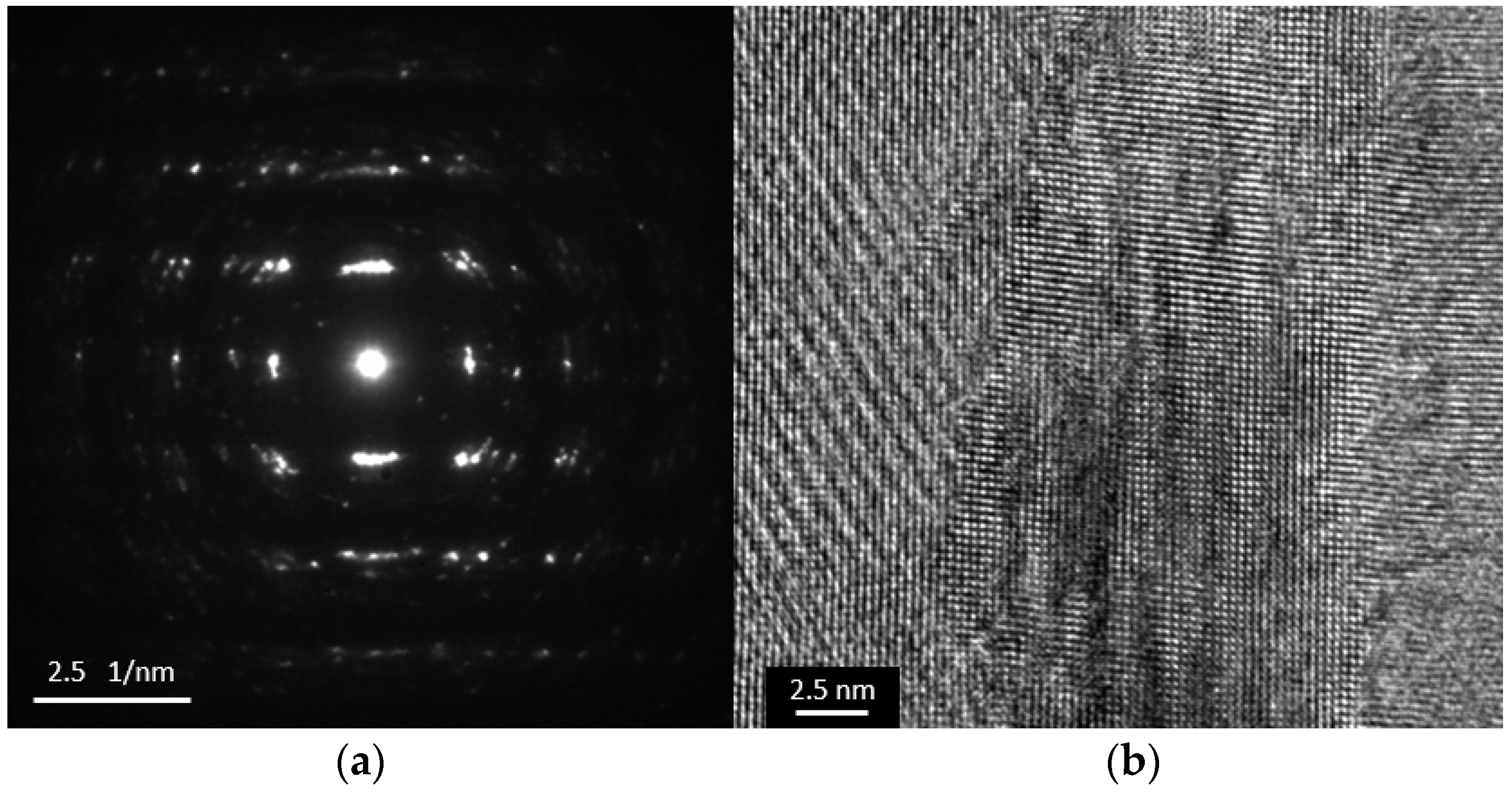 In the conclusions from References [26,27], the figure of merit (ZT) is an anisotropic property. The single peak of the (110) highly oriented structure has the highest value of ZT. The (110) highly oriented structure yielded for thick films are one of the achievements from this research. In contrast to the constant deposition method, the clear SEAD pattern of the pulsed-deposited sample reveals that it basically possesses a single crystalline structure with a major Bi2Te3 phase, as shown in Figure 14a. From the HRTEM observation in Figure 14b, the distance between two neighboring faces is estimated to be approximately 2.2 Å, which is the same as the inter-planar distance between the (110) lattice planes.