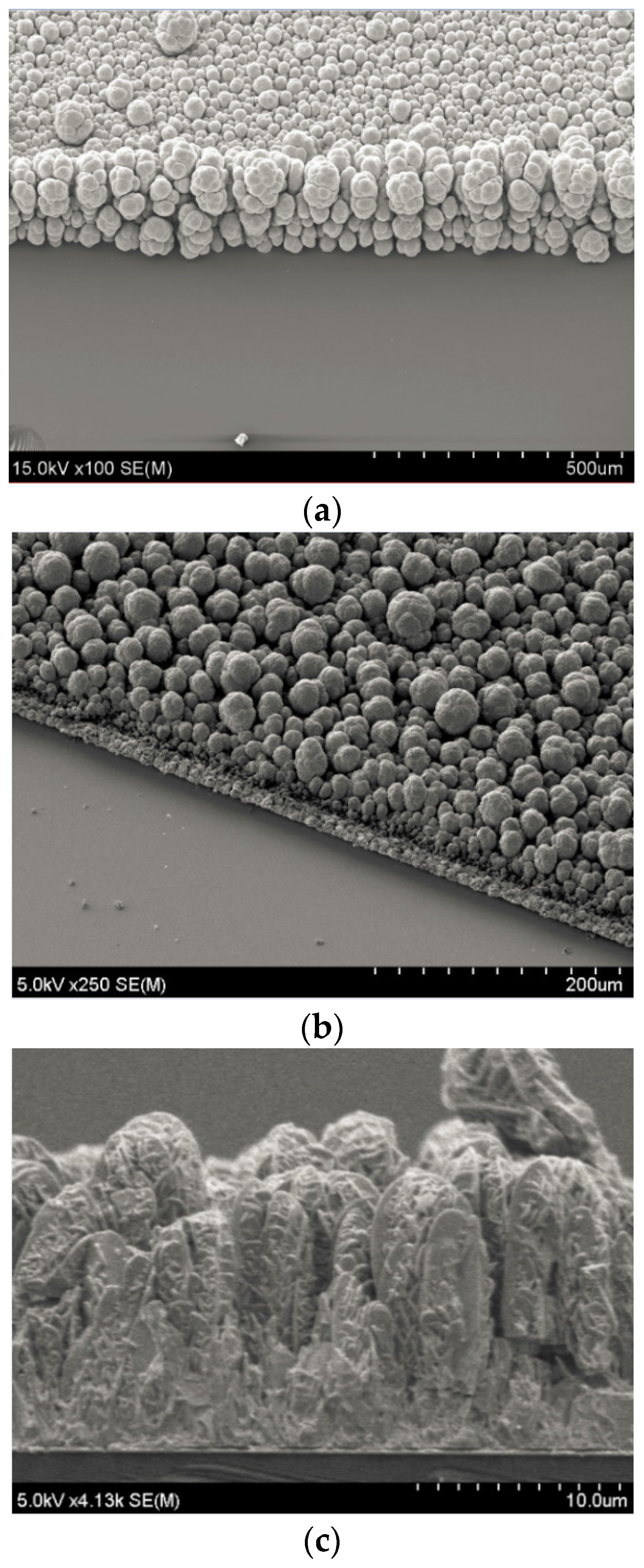 The electron diffraction pattern and the HRTEM image are shown in Figure 7a,b, respectively. The SAED observation illustrates many diffraction patterns that overlap along the concentric circles, indicating grain texturing. It is concluded that the sample consists of polycrystalline nanograins. When the deposition is performed for a long time, the oxidation of Bi or the over-deposition of Te leads to a change in the stoichiometry and causes stressed or porous layers. These layers become unstable as the layer thickness increases. For this reason, only a small number of studies have been successful in synthesizing thick films of BiTe and SbTe [3,14,15,16,21]. As shown in Figure 8a, although a 200-µm-thick film can be grown using the constant method at a high deposition rate of approximately 30 µm/h, only 20 µm of the thickness is actually of good quality (Figure 8b). The thick film layer on the top contains porous structures or particles that easily peel from the underlying layer. The 10-µm-thick layer in Figure 8c exhibits an initial 4-µm-thick layer that has a compact structure. Upon further deposition, the porous structure begins to appear. To solve this problem, another method and technique must be considered when synthesizing a thick film.