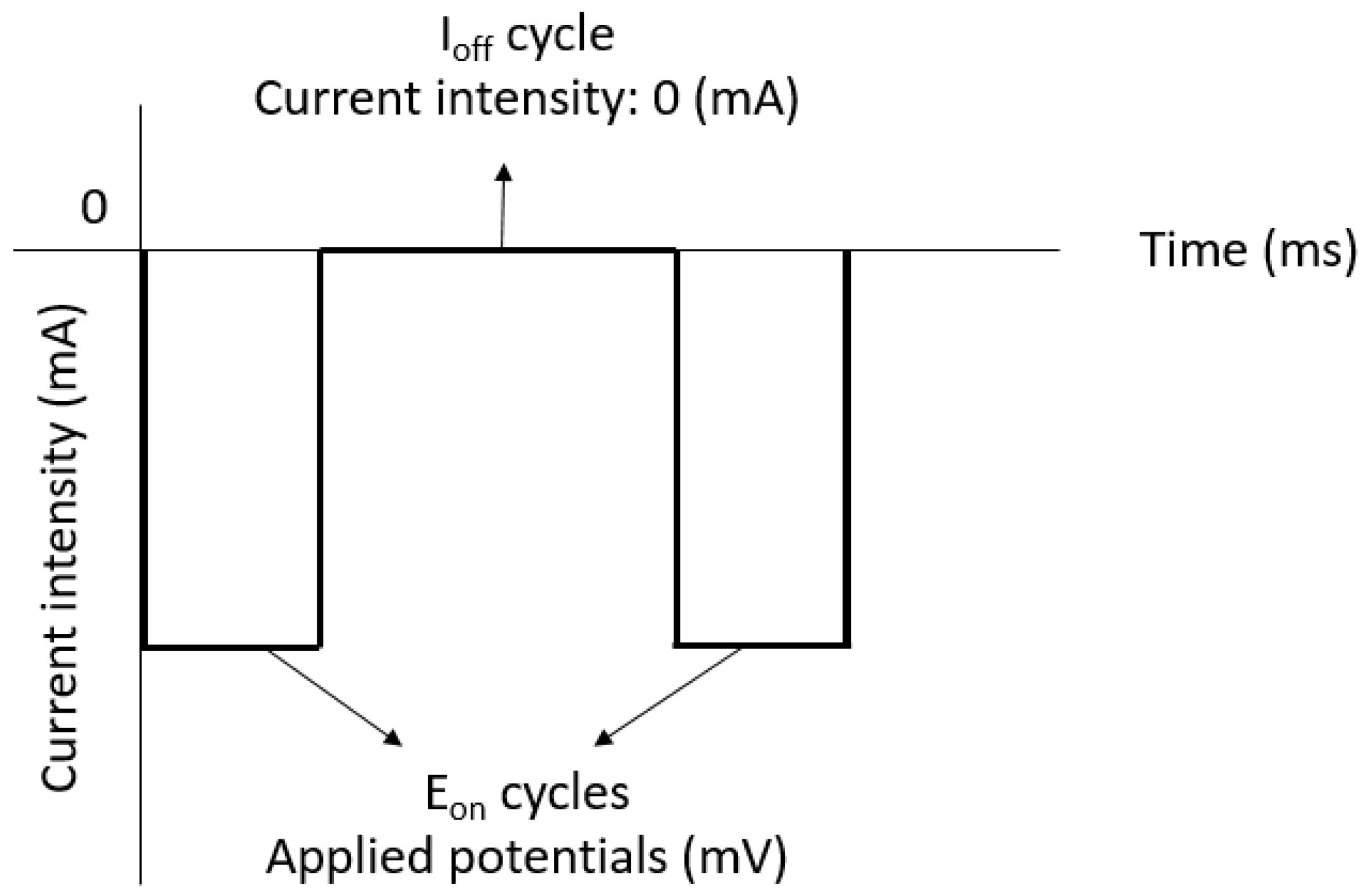 To synthesize thick Bi2Te3 films, pulsed electrochemical deposition is performed using a waveform shown in Figure 9. The applied potentials used in the pulsed deposition alternate between Eon cycles and Ioff cycles. At the Eon cycles, the potential condition of the potentiostatic mode is adjusted to grow Bi2Te3, as described in the constant deposition section. Meanwhile, the working electrode current is maintained at 0 mA during the Ioff cycles.