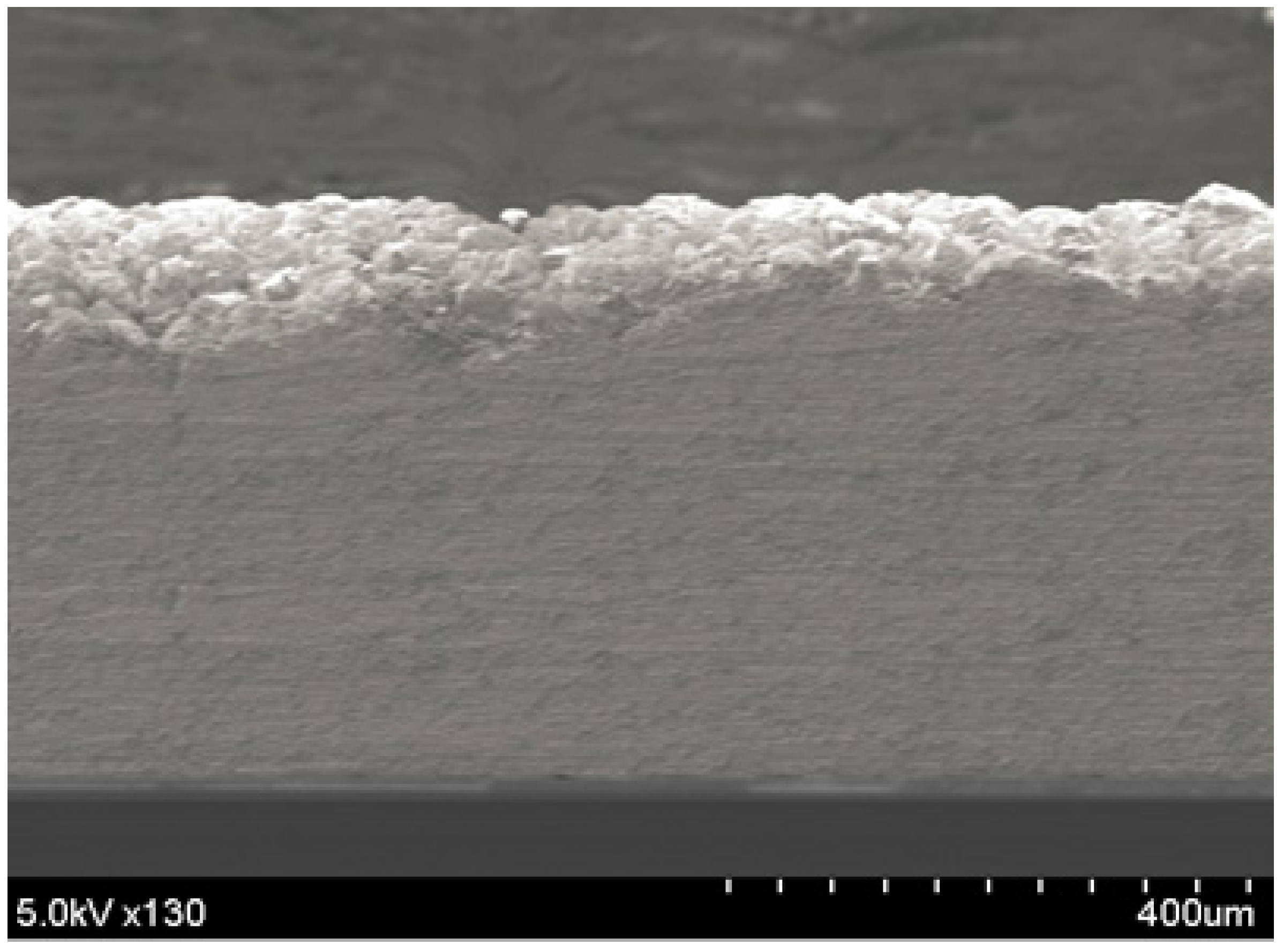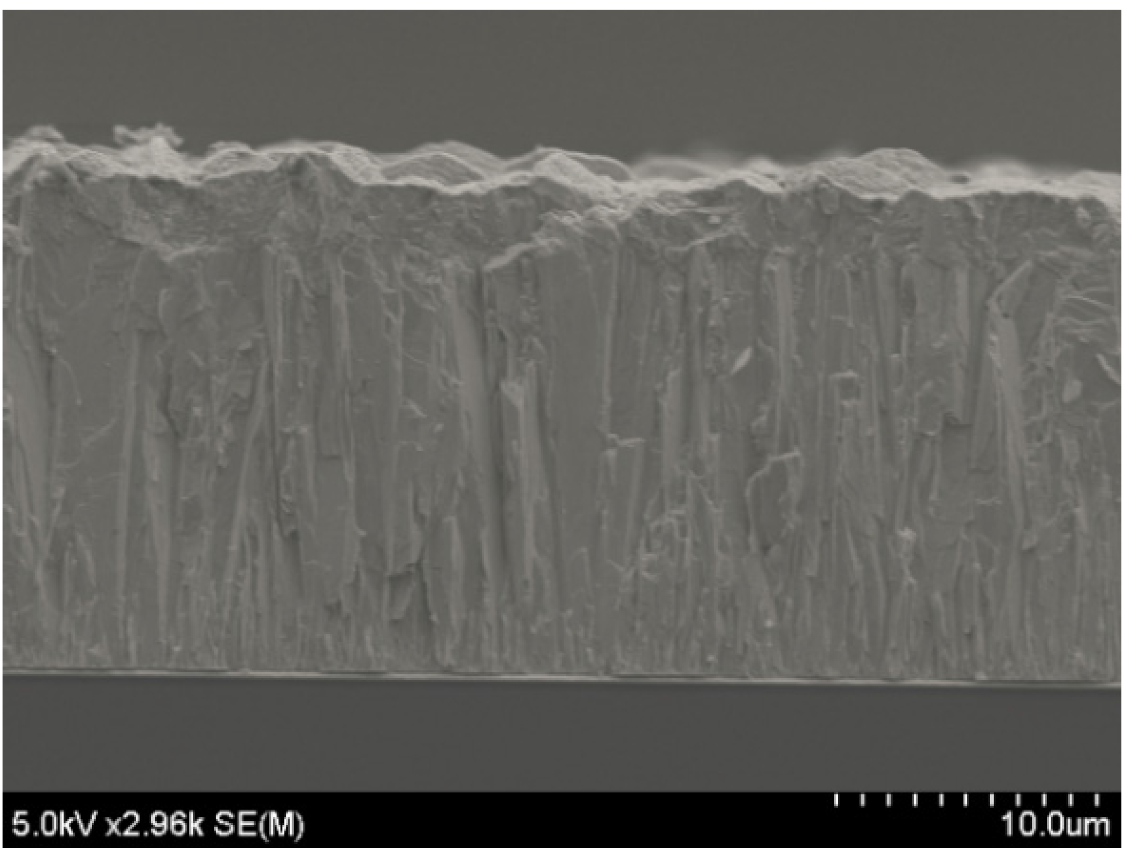 As a result, a film with a thickness of approximately 600 µm and single crystalline bulk-like structure is achieved, as shown in Figure 12. The deposition rate is approximately 10 µm/min. An XRD measurement is performed to analyze the crystal growth orientation of the synthesized films.