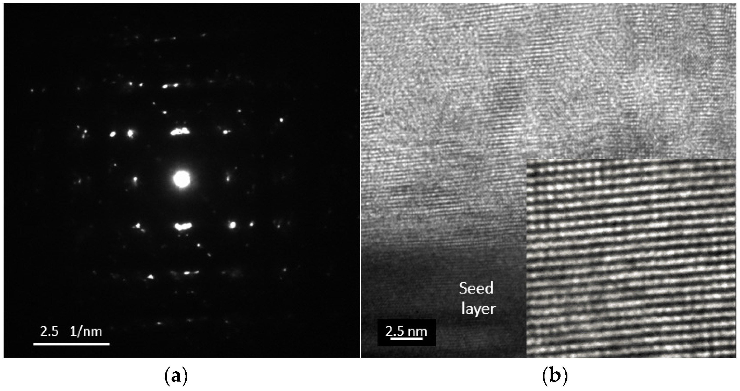 Because a material property evaluation needs to be conducted on an insulating substrate to avoid short circuiting, the synthesized films are peeled from the substrate by epoxy resin and mounted on a glass substrate [17]. The in-plane Seebeck coefficient is measured at room temperature between two points of the film. The temperatures are observed by 50 µm diameter K-type thermocouples. Multiple measurements are carried out at many temperature differences from 4 to 8 °C to ensure accurate results. The Seebeck coefficient, obtained from the generated voltage as a result of given temperature gradient, is measured for these samples. The electrical resistivity is measured using a four terminal method. Synthesized films are imaged by Scanning Electron Microscopy (SEM) equipped with Energy Dispersive X-ray spectroscopy (EDX), which is used for composition analysis. These measurements are performed on a Field Emission Gun Scanning Electron Microscope Hitachi SU-70 (Hitachi, Tokyo, Japan). X-ray diffraction (XRD) patterns of the deposited films are recorded with an X-ray Diffractometer Bruker- D8 (Billerica, MA, USA) using Cu α radiation (λ = 1.5418 Å, 40 kV, 40 mA, step size 0.02°, 2 s/step, and with a sample rotation 60 rpm). The nanostructures of the sample are evaluated by High Resolution Transmission Electron Microscopy (HRTEM) and Selected Area Electron Diffraction (SAED) on a JEOL-2100F instrument (JEOL, Tokyo, Japan). The cross-sectional preparation is performed by a mechanical thinning and dimpling method, followed by Ar+ ion beam milling to make the area transparent to electrons.