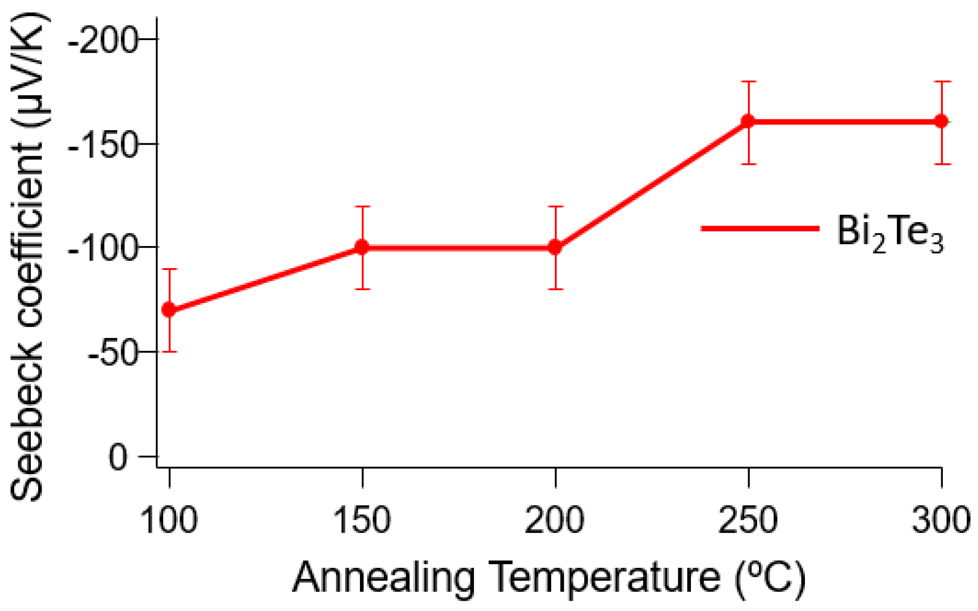 Additionally, this paper reports how annealing affects the Seebeck coefficient and electrical resistivity of the Bi2Te3. The Bi2Te3 films are annealed at various temperatures in N2 at ambient conditions for 1 h. The heat ramp rate during the annealing process is 2 °C/min. Then, the films are analyzed using EDX to confirm that there is no elemental oxygen detected to prevent the formation of oxidation during the annealing process. The result shows that, although annealing can improve the thermal and electrical properties of materials, some annealing temperatures are found to optimize material performance. The highest Seebeck coefficient for the Bi2Te3 films is found at an annealing temperature of approximately 250 °C, as shown in Figure 15.