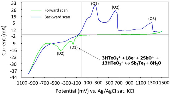 To understand the formation mechanism for SbTe during the deposition process, the cyclic voltammetry of the reactions is studied. The potentials are swept over a range from −1.0 to 1.5 V at a scan speed of 10 mV/s. According to the cyclic voltammetry results shown in Figure 16, two main reduction peaks (D1 and D2) and three oxidation peaks (O1, O2, and O3) are observed. The first main reduction peak, D1, is located at approximately −150 mV, which correlates to the formation of SbTe films, whereas the following reduction reaction appears at −450 mV because of hydrogen evolution [23,30]. The three oxidation peaks correspond to the process of stripping the Te atoms. Therefore, a potential range between −200 mV and 100 mV is determined to be an appropriate potential condition for depositing SbTe films on a gold film. The reaction taking place during the deposition process is shown to be [23]: