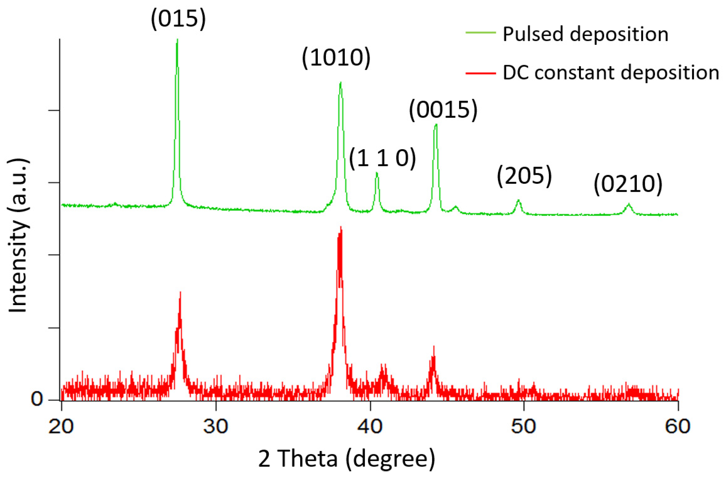 The X-ray diffraction proves that the pulsed-deposited Bi2Te3 thick film possesses a Rhombohedral-hexagonal structure, as shown in Figure 13 [14]. The most intensive peak (110) occurs at 41° of two theta while peaks at (015) and (103) are eliminated and become almost unobservable. This result is in agreement with previous studies of Bi2Te3 thin films [19,24,25]. In comparison with constant deposited films, the diffracted peak intensity becomes much narrower. This change indicates a significant increase in the grain size and improved crystallinity. This again confirms the results from the SEM observation, which indicates the difference in crystal growth between the constant and pulsed deposition methods. It is clear that the Bi2Te3 films grown using constant deposition change from a polycrystalline to a (110) single crystal-like structure when using pulsed deposition.