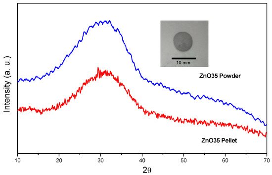XRD patterns of the starting glass powders of ZnO35 and the obtained ZnO35 sintered pellets at 630 °C (insert photograph of ZnO35 pellet).