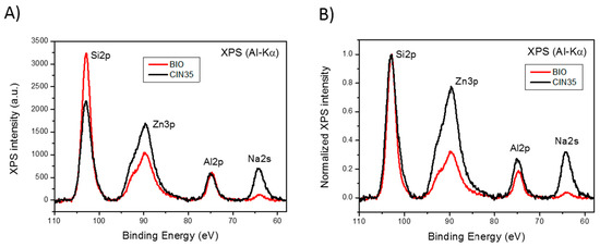 X-ray photoelectron spectroscopy (XPS) spectra in the Si2p, Zn3p, Al2p, and Na2s region of the ZnO35 pellet and the ZnO35 pellet after being immersed for 40 days in LB (labelled as BIO). (A) XPS signals upon background subtraction; (B) signals normalized to the Si2p peak upon background subtraction.