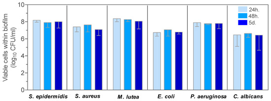 Despite some interspecies differences in the ability to form biofilms, biofilm cell loads harvested from G1 pellets were not significantly different, irrespective of the maturation age of the biofilms: 24 h, 48 h, or 5 days (Figure 4). The mean number of viable cells within the biofilm for all species after 24 h and 5 days of biofilm development ranged from 2.88 × 106 to 2.37 × 108 CFU/mL and from 2.72 × 106 to 6.30 × 107 CFU/mL, respectively.