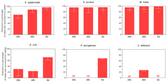 Zinc-containing pellets decreased biofilm formation in comparison to G1 controls. As shown in Figure 5, the antibiofilm effect exerted by ZnO35 was species-dependent and increased in a time-dependent manner. Reductions in biofilm cell load increased from 24 h to 5 days for all species and significantly so for P. aeruginosa (p = 0.006). After 5 days, biofilm burdens of Gram-positive bacteria were strongly reduced by 97.1% (p = 0.0011), 99.8% (p = 0.0083), and 96.4% (p = 0.0189) for S. epidermidis, M. lutea, and S. aureus, respectively; moderately reduced for E. coli, 71.8%, and P. aeruginosa, 61.2%, and virtually not reduced for the yeast, C. albicans.