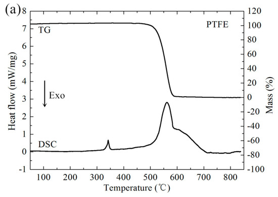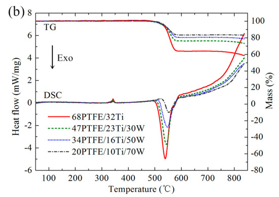 - PTFE/Ti/W composites undergo exothermic reactions at 510 °C to 600 °C, which overlaps the temperature range of PTFE decomposition. The major reaction product is TiFx, and little W undergoes any chemical change. The reaction heat is significantly reduced with increasing W content.