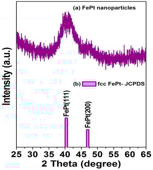 (a) X-ray diffraction patterns for the FePt NPs synthesized in phenyl ether; (b) diffraction pattern is the corresponding standard Joint Committee on Powder Diffraction Standards (JCPDS) of disordered fcc FePt phase.