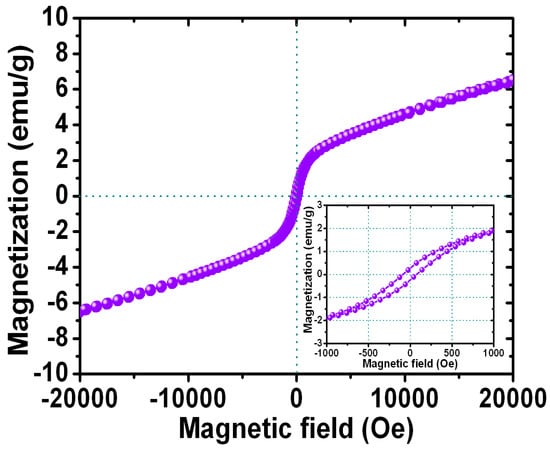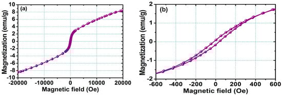 (a) Magnetization loop measured at room temperature for the FePt NPs measured at room temperature; (b) corresponding enlarged hysteresis loop for FePt NPs ranging in the field of ±600 Oe.