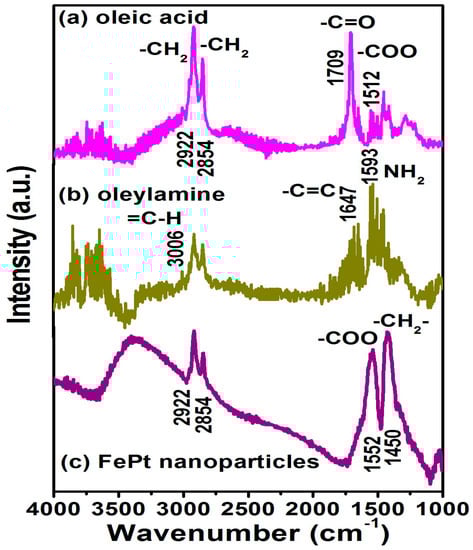 Figure 4 shows the Fourier transform infrared spectroscopy (FTIR) spectra for the FePt NPs synthesized in phenyl ether capped with oleic acid and oleylamine, respectively. Figure 4a,b are the reference spectra for pure oleic acid and oleylamine, respectively. All spectra in Figure 4 reveal the characteristic peaks of the oleyl group: the peaks at 2854 and 2922 cm−1 were due to the symmetric and asymmetric CH2 stretching modes. On the other hand, the peak of the FePt NPs at 1552 cm−1 was due to the bidendate COO mode of oleic acid binding as shown in Figure 4c. The characteristic peak at 1709 cm−1 in the oleic acid spectrum was due to the vibrational ν(C=O) monodendate mode, and the 1512 cm−1 peak was due to the bidendate COO mode in the oleic acid. The characteristic peak at 3006 cm−1 in the oleylamine spectrum was due to the ν(C–H) mode of the C–H bond adjacent to the C=C bond, and the small peak at 1647 cm−1 was due to the ν(C=C) stretch mode. The 1593 cm−1 peak was due to the NH2 scissoring mode, which suggests that oleylamine was adsorbed with the NH2 group intact. Figure 4c indicates the oleic acid and oleylamine both bonded to the as-made FePt NPs synthesized in phenyl ether, thus causing the presence of bidentate carboxylate bonding to the as-synthesized NPs. The observation of both peaks at 1552 and 1450 cm−1 was due to the vibrational ν(COO) and stretching (CH2) modes, indicating that oleic acid and oleylamine complex surfactants bond to the FePt NPs in both monodentate and bidentate types [].