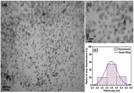 TEM bright field images for the FePt NPs synthesized in phenyl ether after ligand exchange with thiol. (a) Low-magnification image; (b) enlarged magnification of (a); (c) corresponding particle size distribution with Gauss fitting curve, respectively.