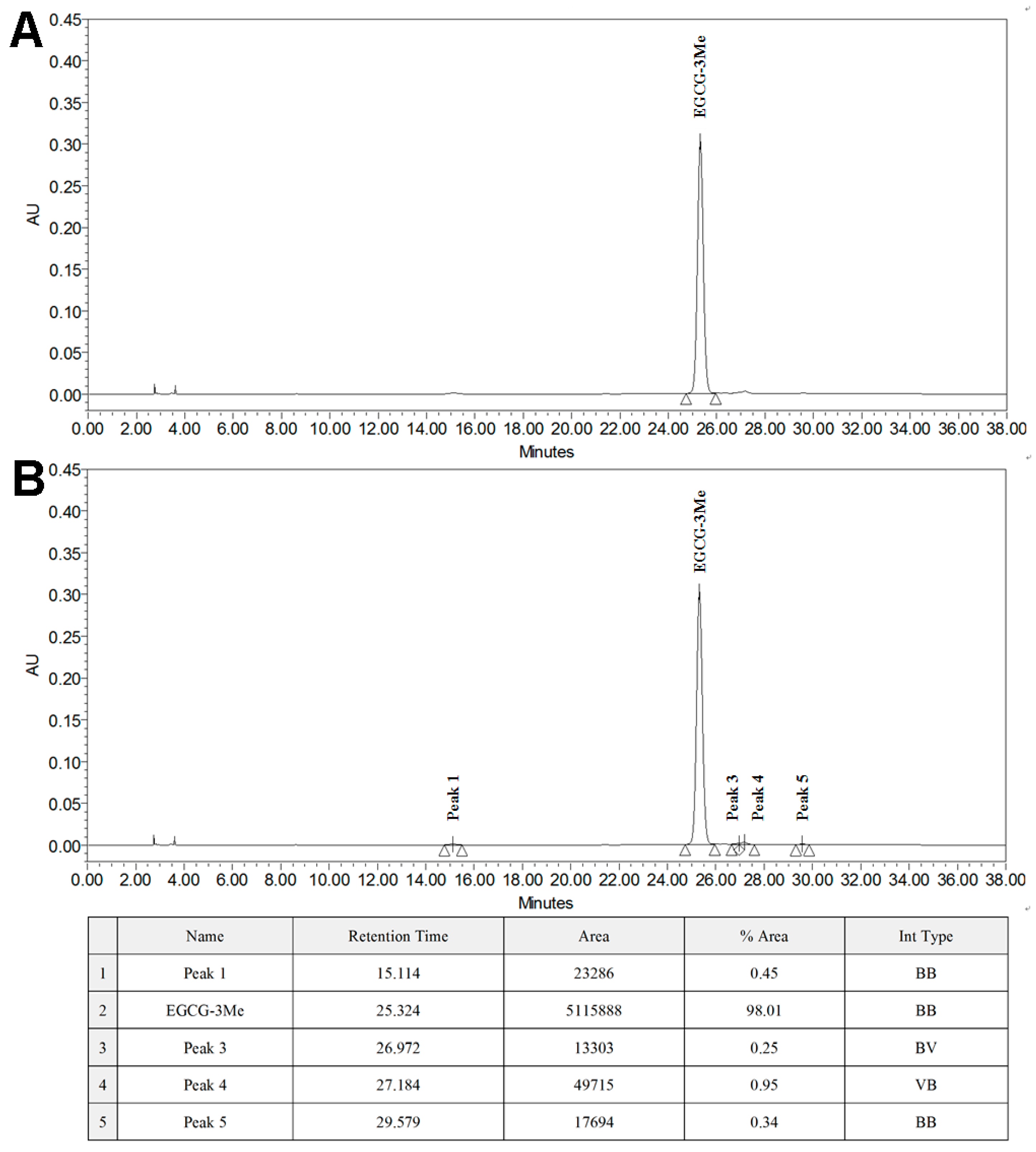 The HPLC chromatograms of: the EGCG-3Me standard (A) and the isolated compound containing EGCG-3Me (B). EGCG, epigallocatechin-3-gallate; EGCG-3Me, epigallocatechin-3-O-(3-O-methyl)-gallate; HPLC, high-performance liquid chromatography.