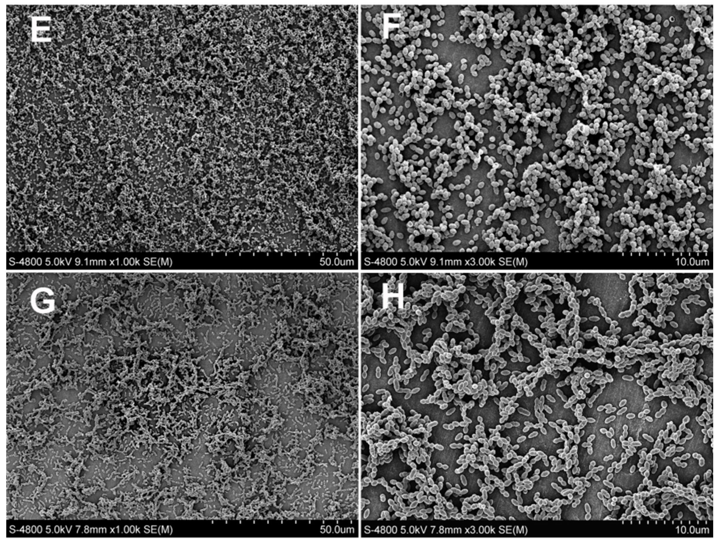 The SEM images (magnification, 1000× and 3000×) are presented in Figure 2 (SB 2 and EGCG groups) and Figure 3 (EGCG-3Me groups). In the control group (Figure 2A,B), dense biofilms were attached to the surface of specimen. Few bacteria were physiologically dead. EGCG and EGCG-3Me inhibited the biofilm formation and this inhibition was concentration-dependent. The amount of dead bacteria residue increased at higher concentrations of EGCG/EGCG-3Me. At the same concentrations, the biofilm was scantier with EGCG-3Me than with EGCG. Only a few bacteria were adherent to the surface of EGCG-3Me 600 group (Figure 3E,F).