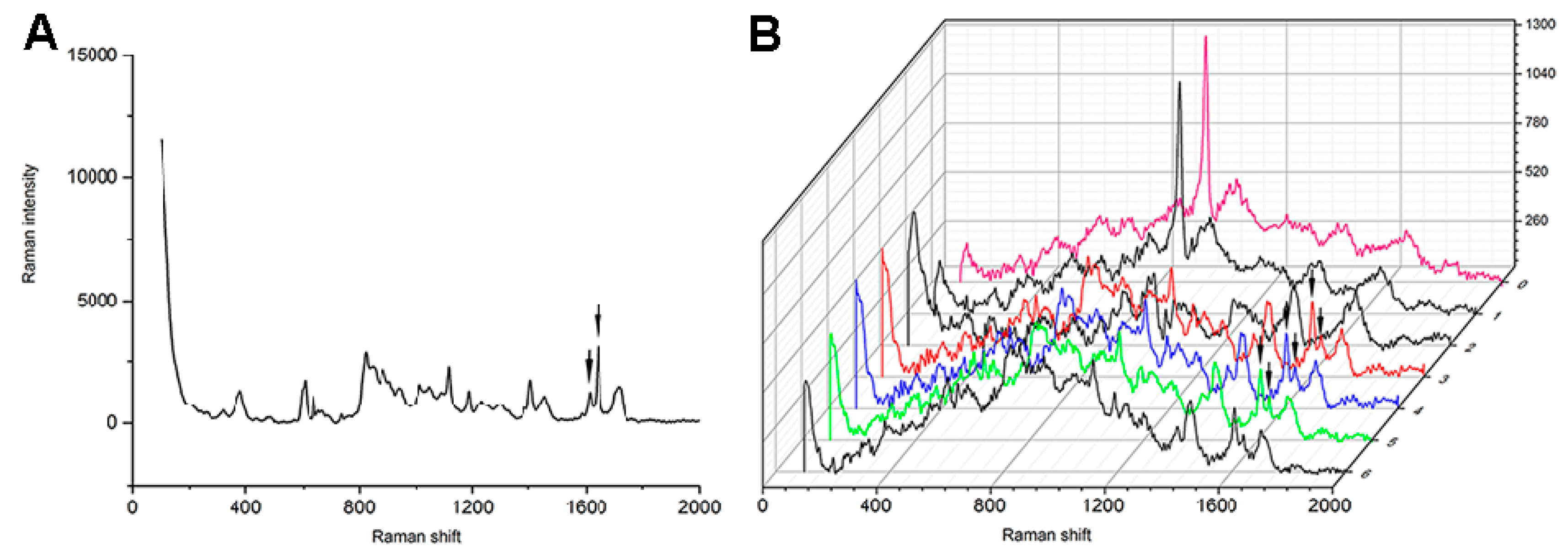 Micro-Raman spectrum of SB 2: The solid arrows represent the adhesive peaks before (A) and after (B) curing at the Raman shift of 1608 cm−1 and at 1640 cm−1. The pink Raman spectrum is the representative spectrum of mineralized dentin; the red Raman spectrum is the representative spectrum of the adhesive at the bottom of the HL; the blue Raman spectrum is the representative spectrum of the adhesive at the middle of the HL; and the green Raman spectrum is the representative spectrum of the adhesive at the surface of the HL. HL, hybrid layer.