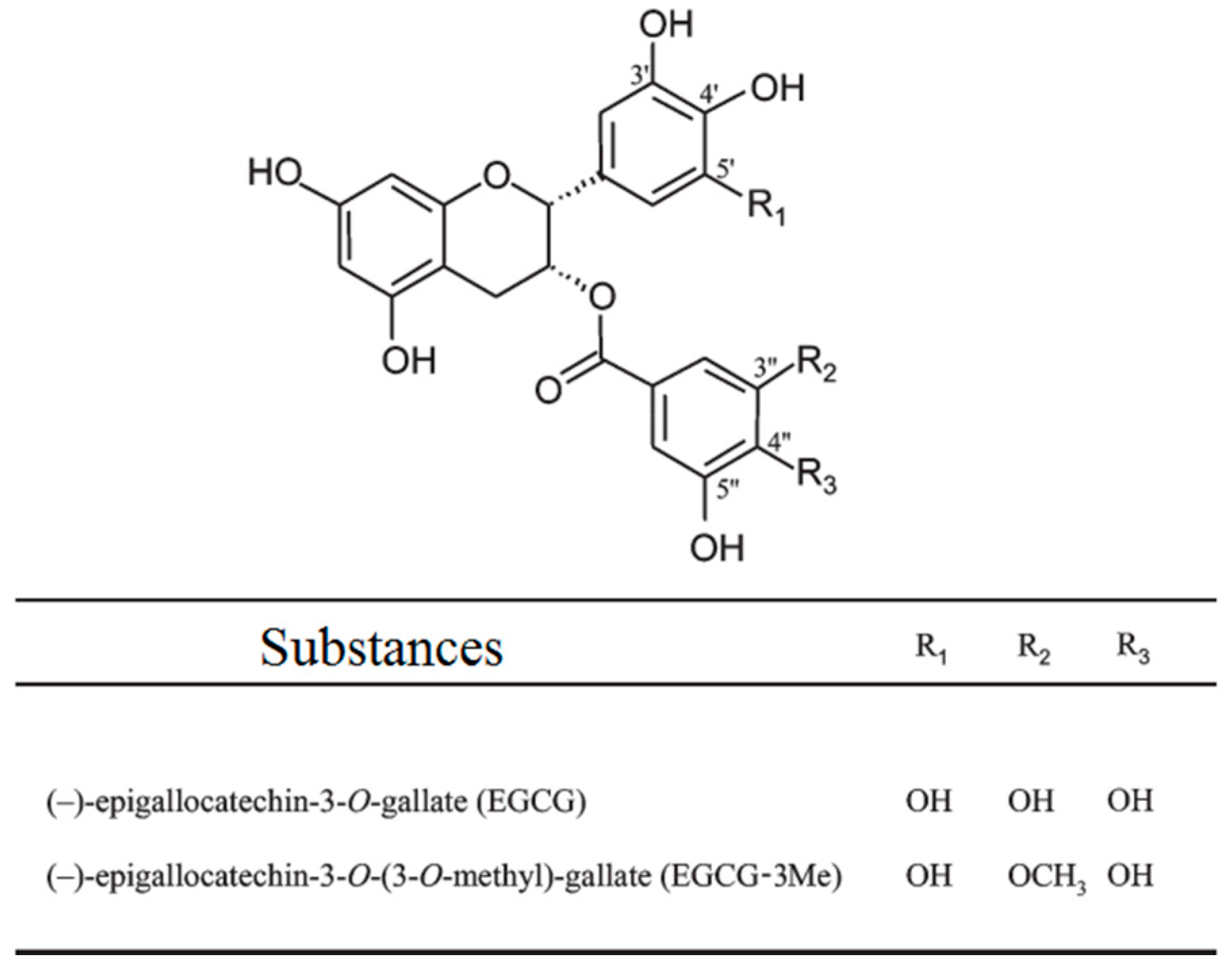 The chemical structure of EGCG and EGCG-3Me. EGCG, epigallocatechin-3-gallate; EGCG-3Me, epigallocatechin-3-O-(3-O-methyl)-gallate.