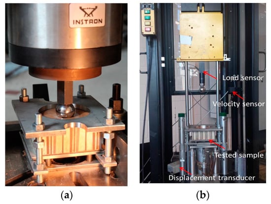 Impact tests are generally divided into low-velocity and high-velocity evaluations. Each one elicits a different structural response and structural damage. For panels used for building construction, transportation or packaging products, low-velocity impact damage is a more common occurrence. To analyze this damage, different energy levels were employed in the low-velocity impact test. A Dynatup drop tower, model 8250, with a free-falling mass was used for the impact test following ASTM D7136 [], Figure 2b. Three different energy levels 40 J, 80 J, and 120 J were used corresponding to drop weights of 22.5 kg at 360 mm and 170 mm and 33.3 kg at 360 mm producing impact velocities ranging from 2 to 3 m/s. In addition, three different diameter spherical load heads, 13 mm, 25 mm and 38 mm were used for our tests. The clamping fixture used to hold the impact test samples during impact had a 102 mm diameter opening. The sample was securely clamped by air cylinders. A 22.2 kN load cell was connected to the load head to measure the impact load. Impulse software was used to record and display load, impact speed, and displacement data.