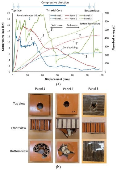 (a) Typical load and absorbed energy vs. displacement curves of panels in the quasi-static compression; (b) Typical failure modes of panels in the quasi-static compression.