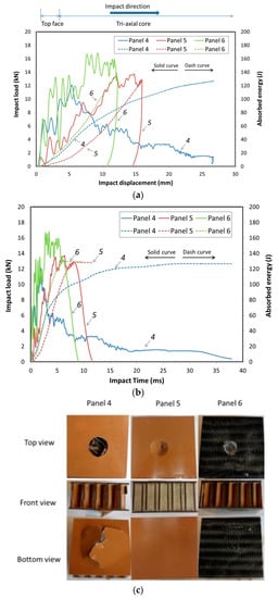 (a) Typical load and accumulated absorbed energy vs. displacement curves using 120 J impact energy; (b) Typical load and accumulated absorbed energy vs. impact time curves using 120 J impact energy; (c) Observed failure of three panel types after the impact test.
