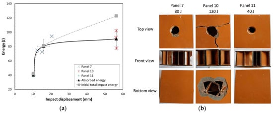 (a) Absorbed energy vs displacement at different initial impact energies; (b) Failure modes for panels at different initial impact energies.
