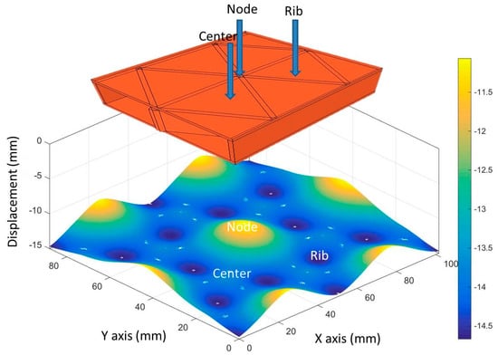 Figure 6 shows a gradiant map of simulated full-field displacements at the locations based on the experimental results. The three impact displacements associated with center, mid-rib, and the rib intersection or rib-node locations were plotted. Panels 7, 8, and 9 were all impacted with 80 J of energy. These showed that the impact at the node had the smallest average displacement, 11.1 mm, followed by the center where average displacement was 13.7 mm, and the greatest average displacement was at the mid-rib with 14.7 mm. The results were expected for the rib intersection being the least displacement since the rib density was the highest at that point and provided the greatest resistance to penetration into the core. Panel 7 had the next highest average displacement where impact occurred at the center, this was initially counter-intuitive. However, after further analysis of the failure mechanism, we found that the impact head diameter was larger than the inscribed diameter between center to the ribs. The impact energy was absorbed by portions of three ribs after the impact-head broke through the face. For panel 8, the maximum average displacement, was located at the mid-point of only one rib. At impact, we believe, the one rib buckled allowing more displacement than the other two locations.