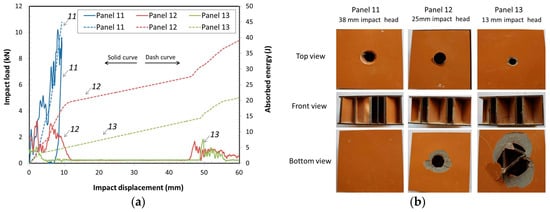 Impact energy 40 J: (a) Impact load and absorbed energy vs. impact displacement by different impact heads; (b) Failure modes of panels by different diameter impact heads.