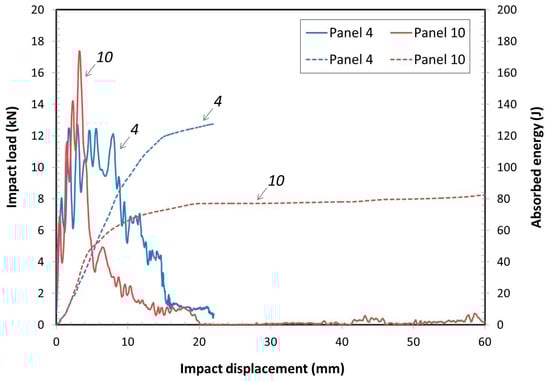 Typical impact energy and accumulated absorbed energy vs. impact displacement results are shown in Figure 4a from the impact load at 120 J. These showed that panel 4 made from just paper laminate had the deepest average impact penetration, 27.8 mm. The average impact peak load for panel 4 was 12.6 kN, the lowest of all the tested panels, because the stiffness and strength of the laminated paper composite was significantly less than the carbon fiber fabric reinforced faces. Panel 5, with the foam-filled core, had higher average impact peak load, 14.9 kN, with 16.7 mm average impact penetration due to the added foam’s energy absorption and its support of both the faces and the ribs. The average peak load for panel 5 was 18.3% higher than the average impact peak load of panel 4, because the foam-filled core helped to absorb more of the impact load to both core and faces, thus distributing the localized stresses and failures to more of the structure. For panel 6, it had the smallest average impact displacement, 12.8 mm, and had the highest average impact peak load of 17.9 kN. This was because the carbon fiber fabric composite face had higher stiffness and strength and toughness than either the laminated paper composite alone or with foam filled core. The carbon fiber strands radiate in three-axes causing the fiber strands to go into tension radiating out from the center of the impact load.