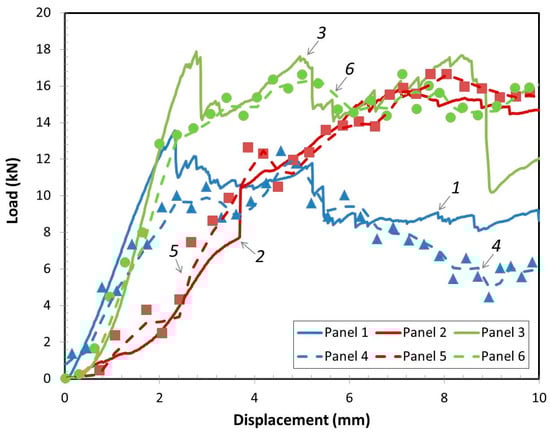 Figure 3b shows the typical failure modes of panels 1, 2, and 3 with different panel configurations. All panels had similar damage on the top face; however, different failures were observed on the bottom, Figure 3b. The foam-filled core, panel 2, had the best integrity where the load had been dispersed into the structure assisted by the foam as compared with panel 1 that had more localized damage. For panel 3, the carbon fiber fabric that increased stiffness and strength of the faces, smaller localized indentation damage on the bottom face was also observed in Figure 3b as compared with the other two types of tested panels with laminated paper faces only. Similar responses were observed for each replicate within the specific series.