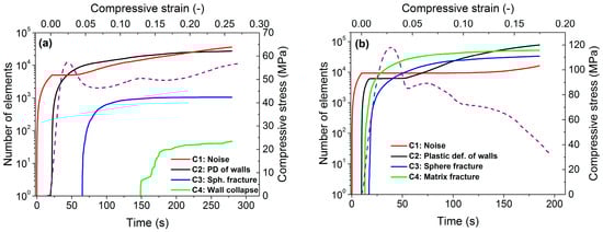 Time evolution of the cumulative number of elements in different AE clusters in (a) Al foam; (b) AlSi12 foam. Red line—noise; black—plastic deformation of matrix; blue—sphere fracture; green—Cluster 4: wall collapse in Al foam and brittle phase fracture of the matrix in AlSi12 foam. The stress-strain curve (dashed line) is also displayed.