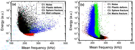 Cluster 4 exhibits rather different features in the two particular foam types. In the case of Al foam, this cluster appears at above 10% strain and the AE signals typically consist of a sequence of small bursts related to the collective collapse of cell walls and resulting in a formation of wide deformation bands []. In the case of AlSi12, however, Cluster 4 emerges even prior to the occurrence of Cluster 3. The signal waveforms are somewhat similar in these two clusters. The energy range of signal elements in Cluster 4 is wide and contains a significant high-energy component, implying that the fracture is the source of AE. On the other hand, the frequency distribution of the AE elements in this cluster is rather narrow when compared with Cluster 3. From these facts, it can be inferred that the source of AE is most likely the fracture of brittle phases in the AlSi12 matrix (the EDX analysis showed that the AlSi12 matrix contains, in addition to a pure Al phase, also Si and intermetallic Al-Si-Fe phases). The size distribution of these inclusions is relatively homogeneous compared with the thickness of ceramic layers within the walls of the hollow spheres (Figure 3b). Furthermore, the elastic wave originating in the fracture of such phases can easily propagate in the foam matrix. Thus, the scatter in the mean frequency is expected to be lower. In conclusion, the recorded AE signals in Cluster 4 result from (i) the collapse of cell walls in Al foam; (ii) the fracture of brittle phases in the AlSi12 matrix.