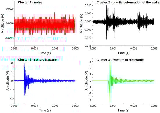 Characteristic AE waveforms corresponding to different clusters in AlSi12 foam: Cluster 1: noise; Cluster 2: plastic deformation of the walls; Cluster 3: sphere fracture; and Cluster 4: fracture in the brittle phase of the matrix.