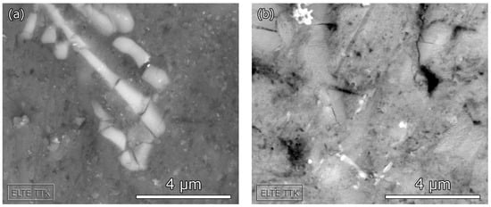 The compressive strength of AlSi12 foam is higher than that of the foam with pure Al matrix and this finding agrees with previous observations []. The AE response at low strain is somewhat similar to that of Al foam. Plastic deformation of the matrix takes place almost as soon as the compression starts, and the AE activity increases with strain. As the stress rises, fracture-like events take place in the matrix (occurrence of Cluster 4). In order to prove this assumption, we performed SEM observations of the microstructure at this level of deformation. The SEM images in Figure 6 clearly show the fracture of brittle phases in AlSi12. Similar type of damage was observed in Al-Si eutectic alloys after cold rolling []. Increased strength and brittleness in MMS foams with alloyed matrix material can be explained by the strengthening effect caused by the presence of alloying elements and secondary phases formed [].