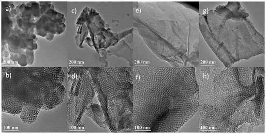 Figure 1 shows TEM images of the synthesized silicas by using F127 and GO as the dual template. The samples are referred to as SiO2/GO-x (x: GO concentration). Figure 1a,b reveals that the silica of SiO2/GO-0 synthesized with the sole template (F127) exhibits a highly-ordered 3D close-packed cage-type mesoporous structure—namely KIT-5 []. When GO is added as a co-template, the resultant silica evolves from the aforementioned 3D particles to a 2D film, and considerable change occurs in both morphology and characteristic dimension. Figure 1c–h shows that the silica film gradually develops with increasing GO concentration. For example, Figure 1e shows that the resultant silica film is complete and thin at 4.64 mg·mL−1. Further increase in the GO concentration yields some aggregation of the silica film, as seen in Figure 1g. Besides, cage-type mesopores are well recognized in the resultant silicas, with diameter in the range of 4–6 nm. It has been proposed that the formation of the 2D mesoporous silica film proceeds by the so-called cooperative assembly mechanism, as discussed in our previous publication []. Briefly, the 2D mesoporous structure is generated with the aid of dual templates. The mesopores are a negative replica of the template F127, and the 2D morphology inherits that of the GO template. The final structure relies on the cooperative assembly among the silica precursor, F127, and GO.