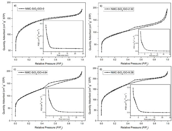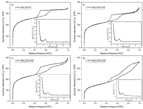Nitrogen ad/desorption isotherms of the synthesized silicas SiO2/GO-x: (a) x = 0; (b) x = 2.32; (c) x = 4.64; (d) x = 9.28.