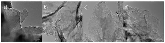 Figure 3 shows the TEM images of the synthesized NMC by using the above silica templates. Figure 3a shows that NMC-SiO2/GO-0 follows the negative replica of SiO2/GO-0, which is a bulky particle associated with an ordered mesoporous structure (Figure S1). In comparison, by using 2D silica film, the other three carbons are 2D film embedded with mesopores, as seen in Figure 3b–d.