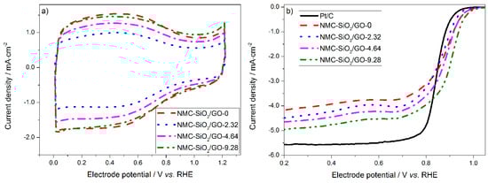 Figure 5 shows the CV curves and the corresponding ORR polarization curves of the carbon materials in 0.10 M KOH solution. Figure 5a shows that all of the curves are similar in shape with large capacitive currents, which can be attributed to their high specific surface area. The capacitive current follows the order: NMC-SiO2/GO-2.32 < NMC-SiO2/GO-4.64 < NMC-SiO2/GO-9.28 ~ NMC-SiO2/GO-0, which agrees well with the change in the specific surface area (vide supra). A broad and electrochemically-reversible wave was observed in the potential range of 0–0.9 V, which is acknowledged to originate from the adsorption of OH− on the carbon surface [,]. In addition, the redox peak associated with iron-containing species is not observed, which indicates that the amount of electrochemically active Fe on the carbon surface is negligible [].