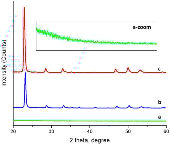 XRD of WO3. Thin films: (a) As-deposited; (b) First thermal treatment T1; (c) Two-step annealing T1 + T2. Inset a-zoom shows the zoomed DRX of the as-deposited sample.