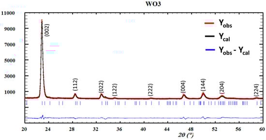 Phase transitions between WO3 polymorphs have been reported to be partially reversible []. For WO3 in bulk, monoclinic (γ-WO3) and triclinic (δ-WO3) phases have been reported to be the more stable phases at room temperature. Thermal treatment of γ-WO3 causes a phase transformation to either orthorhombic (β-WO3) or tetragonal (α-WO3) phases. However, bulk samples do not retain any of these phases (α- and β-WO3) when they are cooled to room temperature. In contrast to what happens to bulk WO3, all of the above phases (α- and β-, γ- and δ-WO3) can be present in WO3 thin films at room temperature, depending on synthesis conditions, showing a diversity of morphologies, crystalline structures, and space groups [].